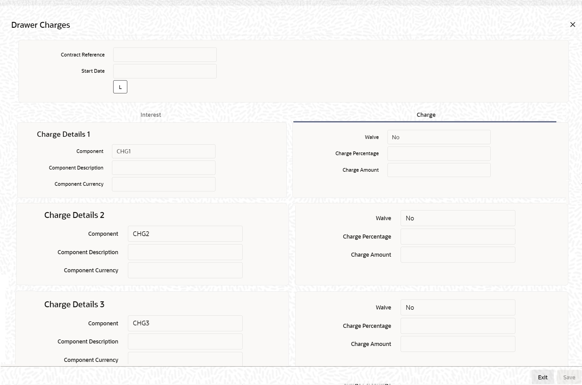 Charge Amount The charge amount is the charge to be levied on the drawer. In case of Partial Liquidation, the system calculates the drawer’s/drawee’s Interest and Charges in full and recovers during the first liquidation. Interest is calculated until the maturity date of the bill. During liquidation, the remaining Bill amount, the drawer’s/drawee’s Interest and Charges are not applicable. During liquidation, the system calculates and displays the amount for each of the defined components.