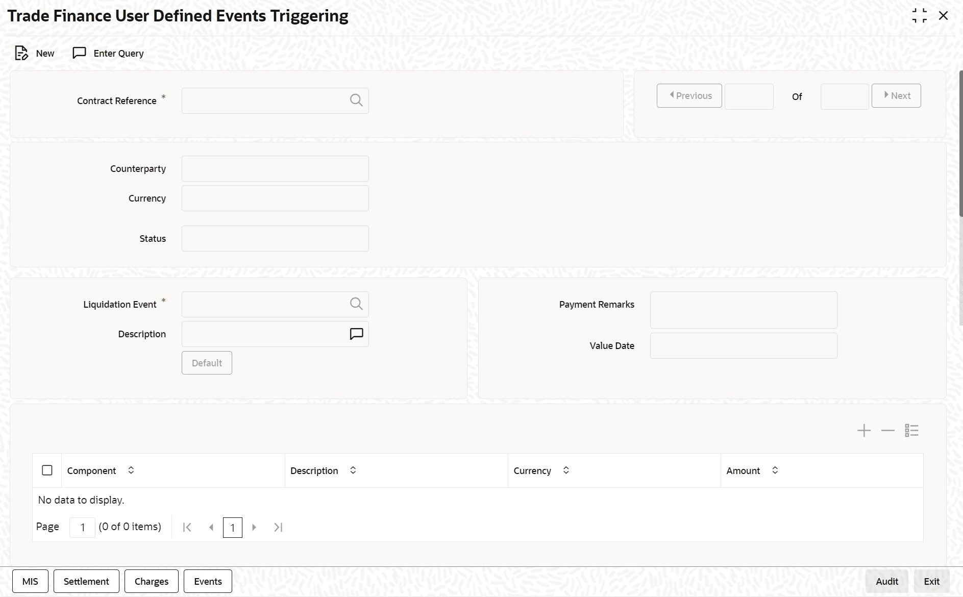 Field Description Contract Reference Number On click of New the contract reference number defaults. Counterparty On click of New the counterparty defaults. Status On click of New the status defaults. Currency On click of New the currency defaults. Liquidation Event Select the event from the adjoining option list. Description Description defaults on select of event from the field liquidation event. Payment Remarks Specify remarks pertaining to the payment on the account. Value Date If the value date derivation rule has been maintained for the event code, the system will calculate the value date and display it here. However, you can change it. Amount Details: The system displays the following amount details