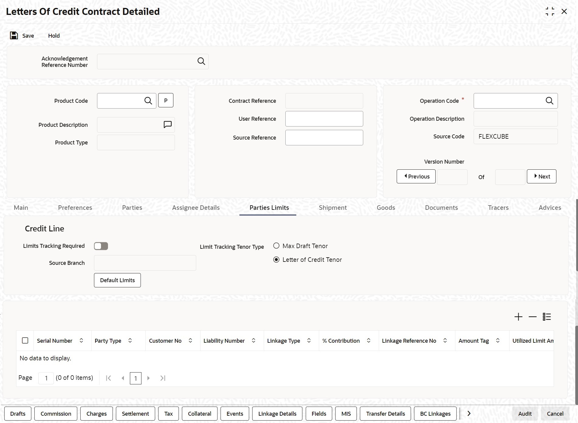- On the Letters of Credit Contract Detailed screen, click Hold button.