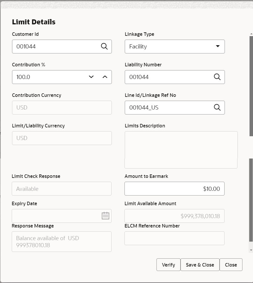 Limit Available Amount This field displays the value of available limit, i.e., limit available without any earmark. The Limit Available Amount must be greater than the Contribution Amount. The value in this field appears, if you click the Verify button.