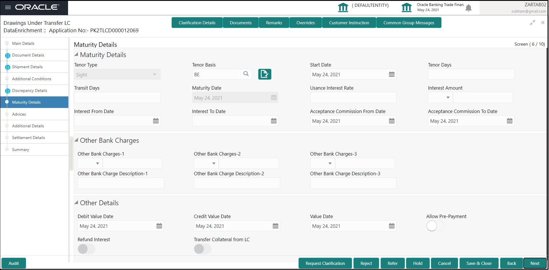 Drawing Under Transferred LC User Guide Drawing Under Transfer LC Data Enrichment Maturity Details 2.3.6 Maturity Details This topic provides the systematic instructions to capture the maturity details. On Maturity Details screen, specify the fields. Figure 2-23 Maturity DetailsDescription of the illustration dematuritydetails.png For more information on fields, refer to the field description table of Maturity Details in Scrutiny stage. Click Next.The task will move to next data segment. For more information on action buttons, refer to the field description Action Buttons of Maturity Details in Scrutiny stage. Parent topic: Data Enrichment