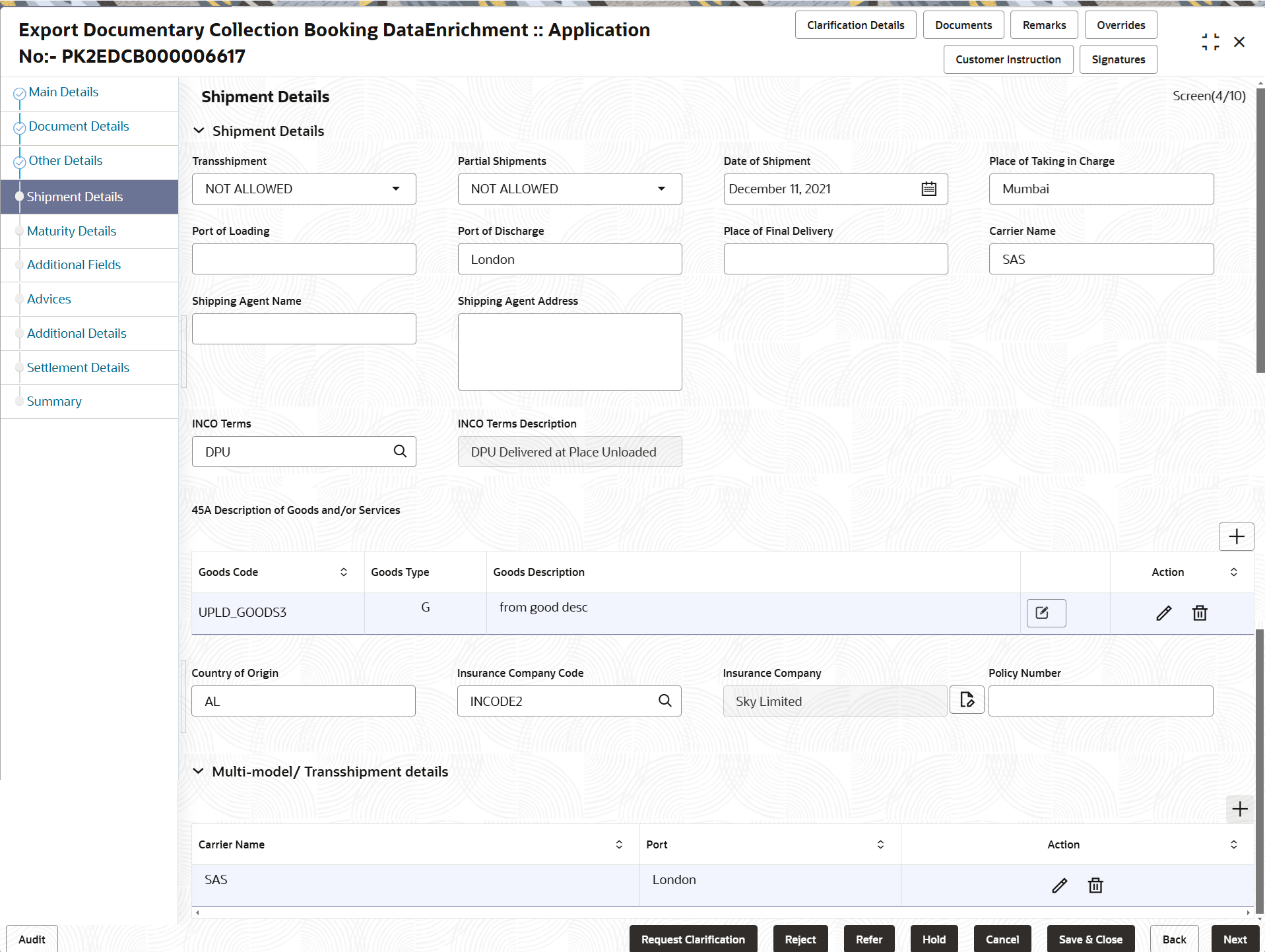 This topic provides the systematic instructions to capture the shipment details of export documentary collection booking request.