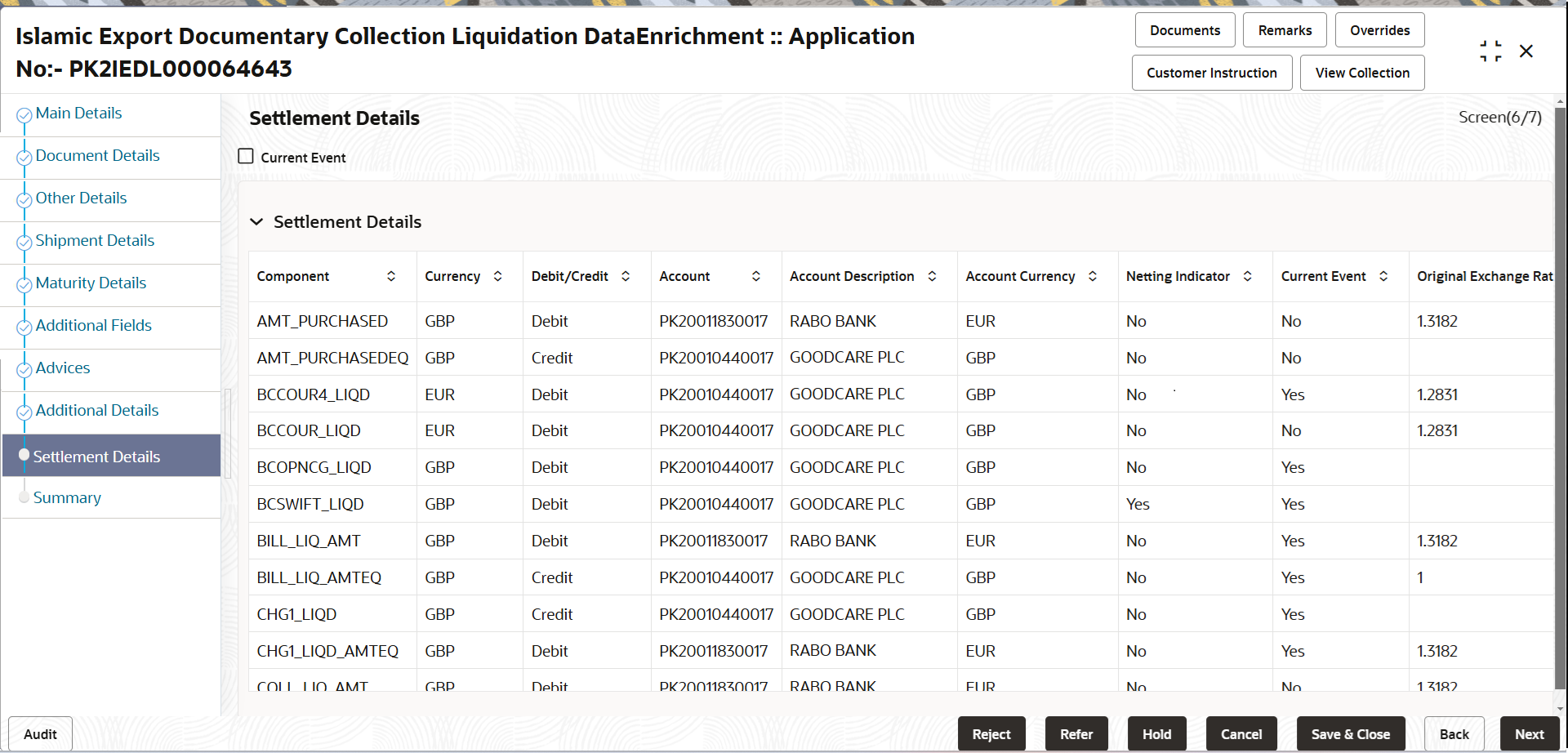 This topic provides the systematic instructions to capture the settlement details of export documentary collection liquidation Islamic request.