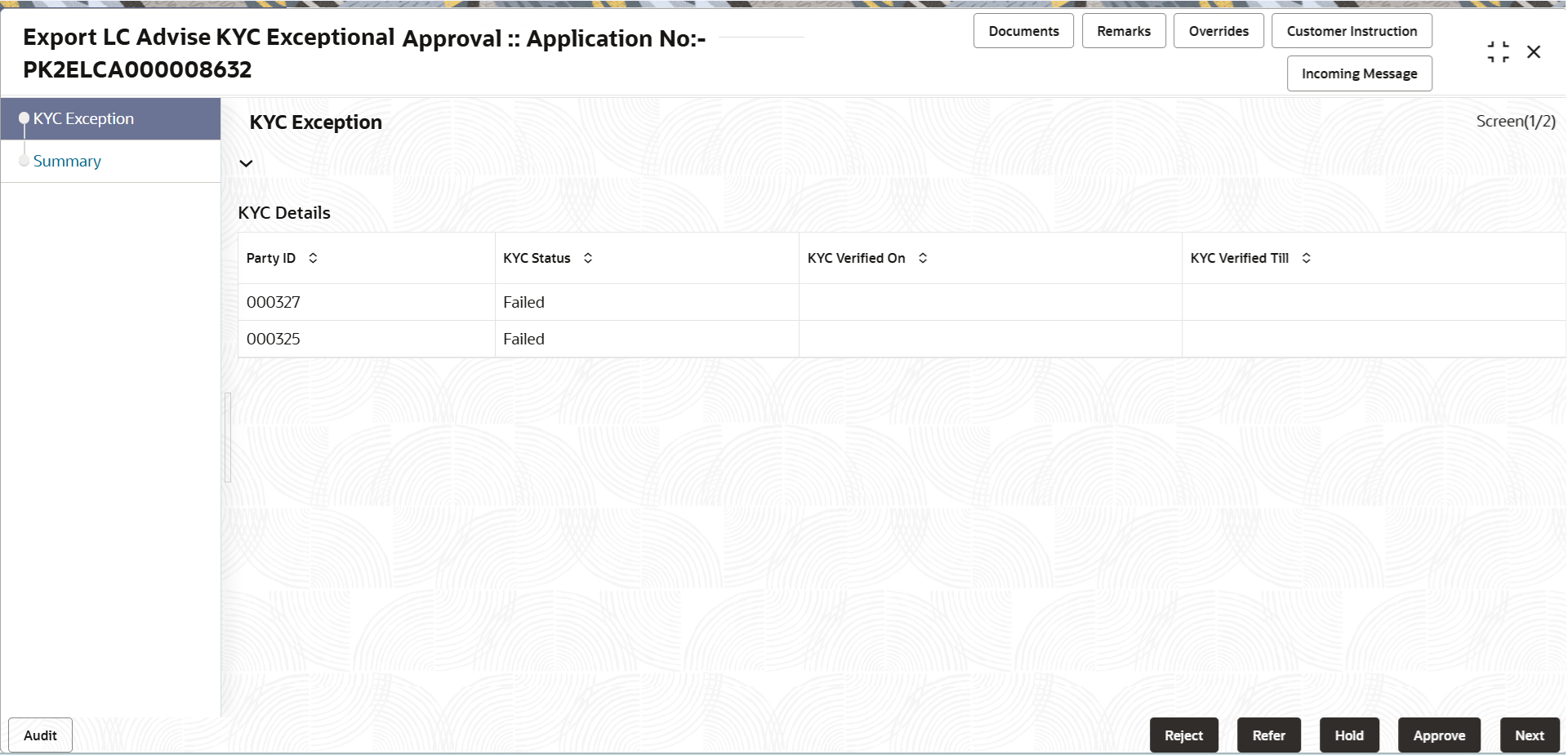 - Log in into OBTFPM application, KYC exception queue. KYC exception failed tasks for Trade Finance transactions will be listed in your queue.