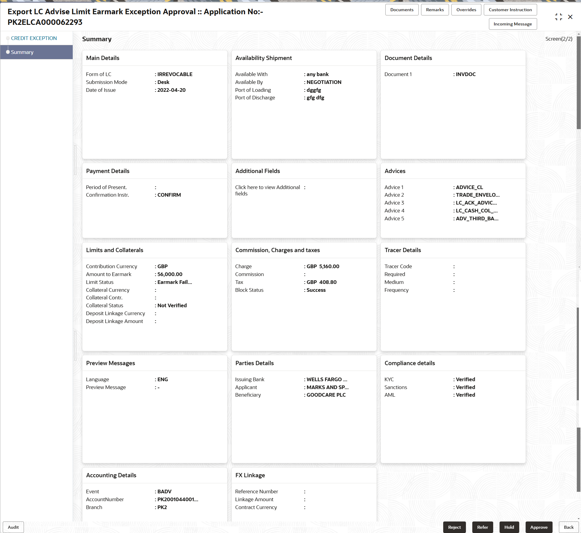 The Export LC Advice request, before it reaches the approval stage, the application will validate the Amount Block, KYC and AML. If any of these failed in validation will reach exception stage for further clearance for the exceptions.