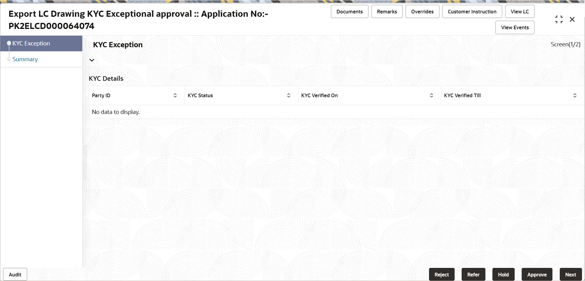 - Log in into OBTFPM application, KYC exception queue. KYC exception failed tasks for Trade Finance transactions will be listed in your queue.