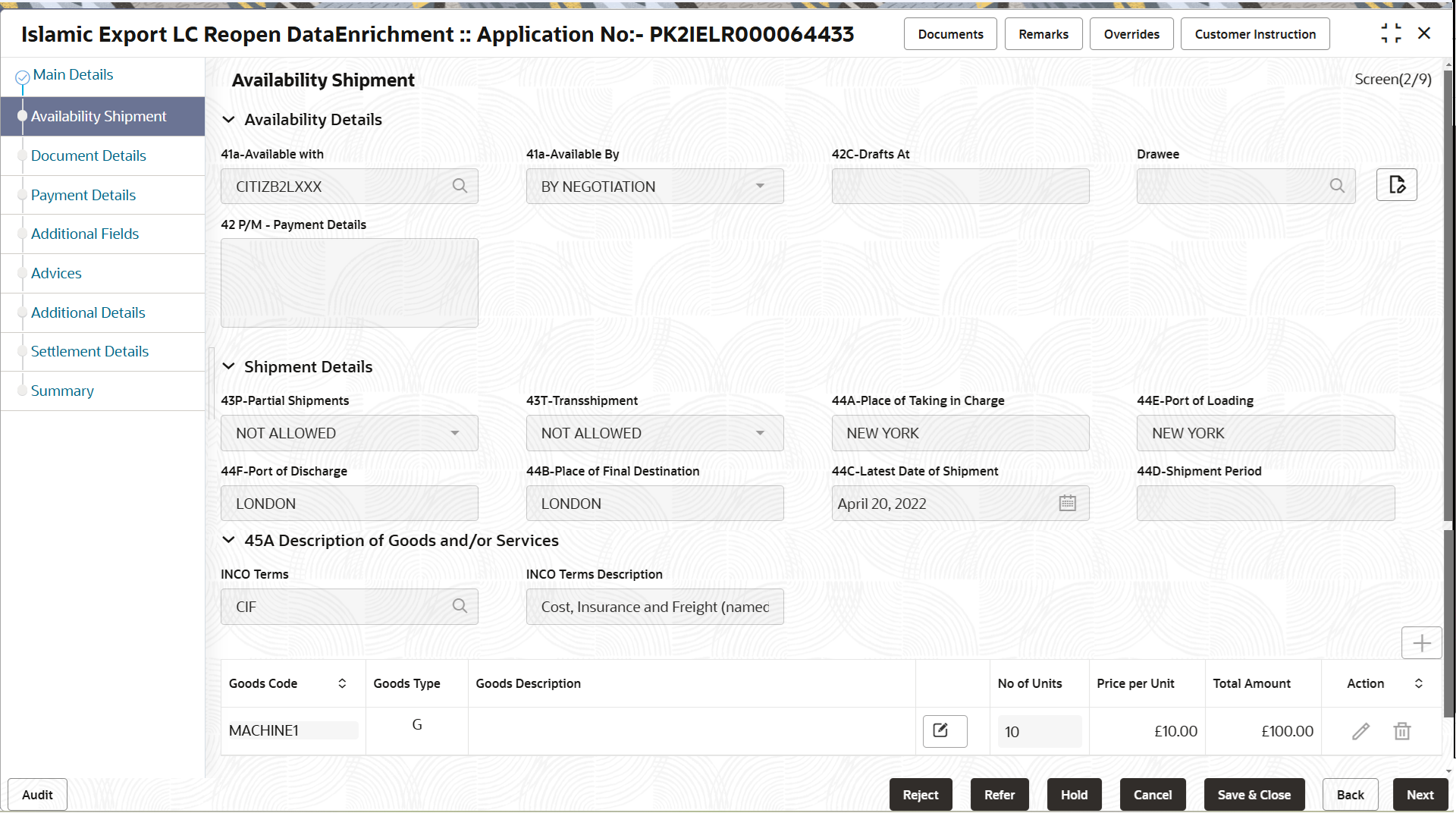 Shipment Details Partial Shipments Read only field. This field displays the partial shipment, as per the latest LC details.