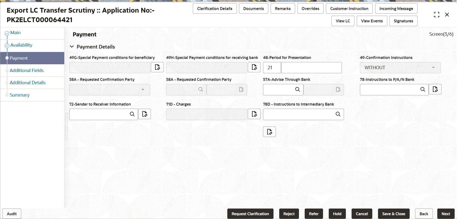 In this section, user can input the Payment details for an Export LC Transfer. As part of Scrutiny, the user can enter the Payment details of an Export LC Transfer request.