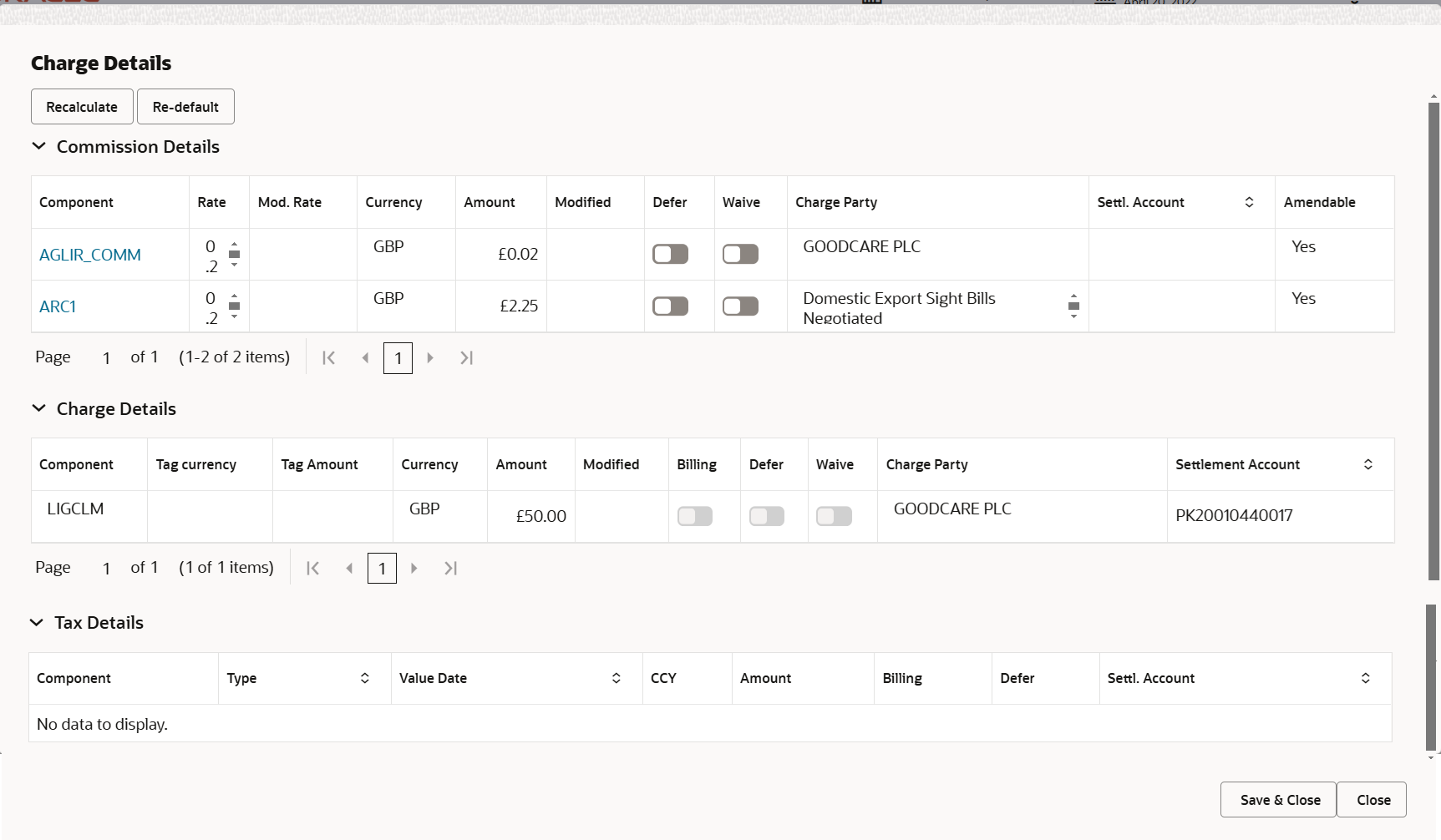 Tracer Frequency Specify the value for tracer frequency. Tracer Receiver Party Click Search to search and select the tracer receiver party from the lookup. Tracer Start Date Select the tracer start date. Start date cannot be earlier than the branch date. Tracer Next Date Specify or select the tracer next date. Discrepancies Approval Date Specify or select the discrepancies approval date. - Click Save and Close to save the details and close the screen.