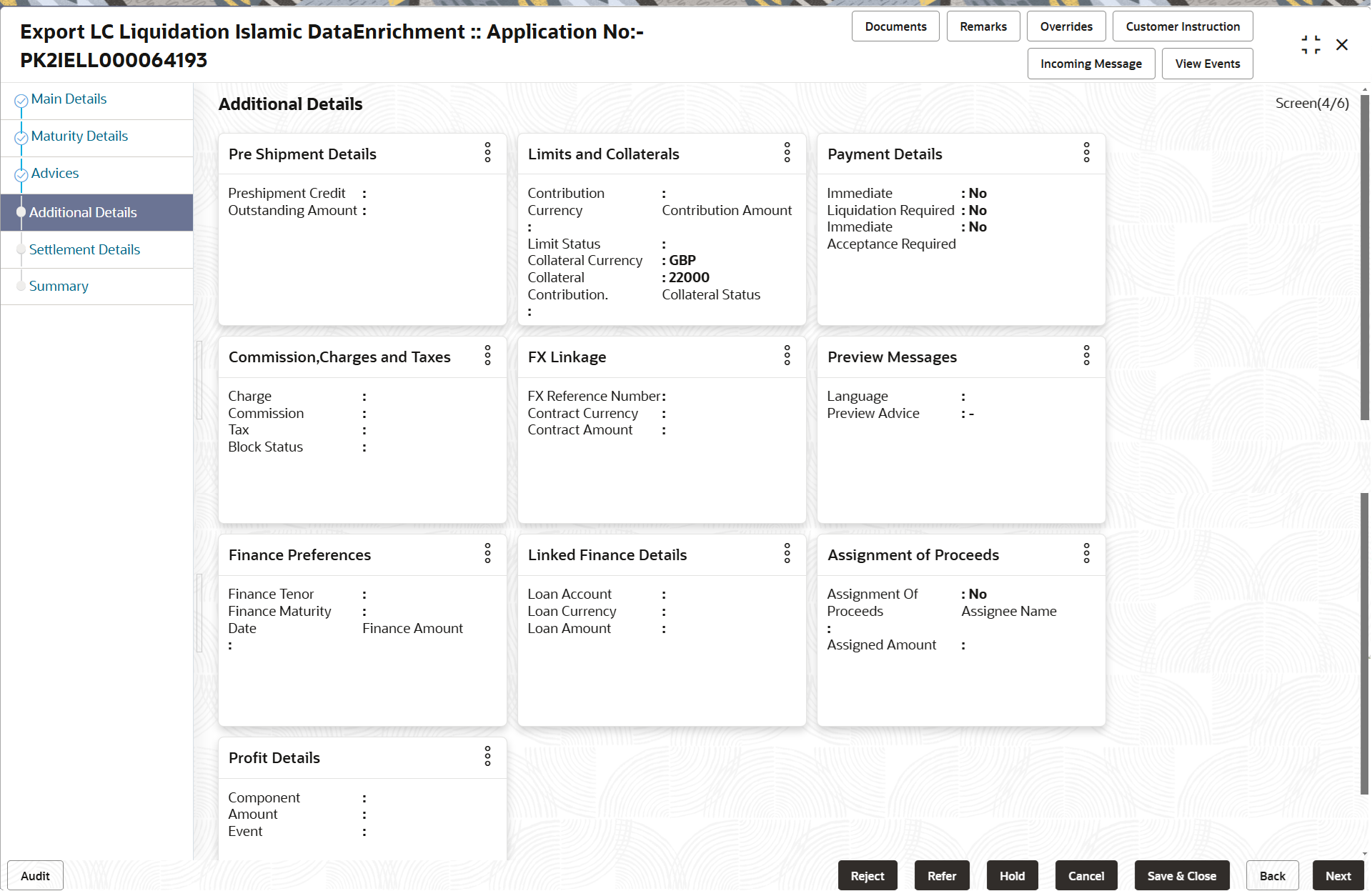 This topic provides the systematic instructions to capture the additional details in Data Enrichment stage of Export LC Liquidation - Islamic process.