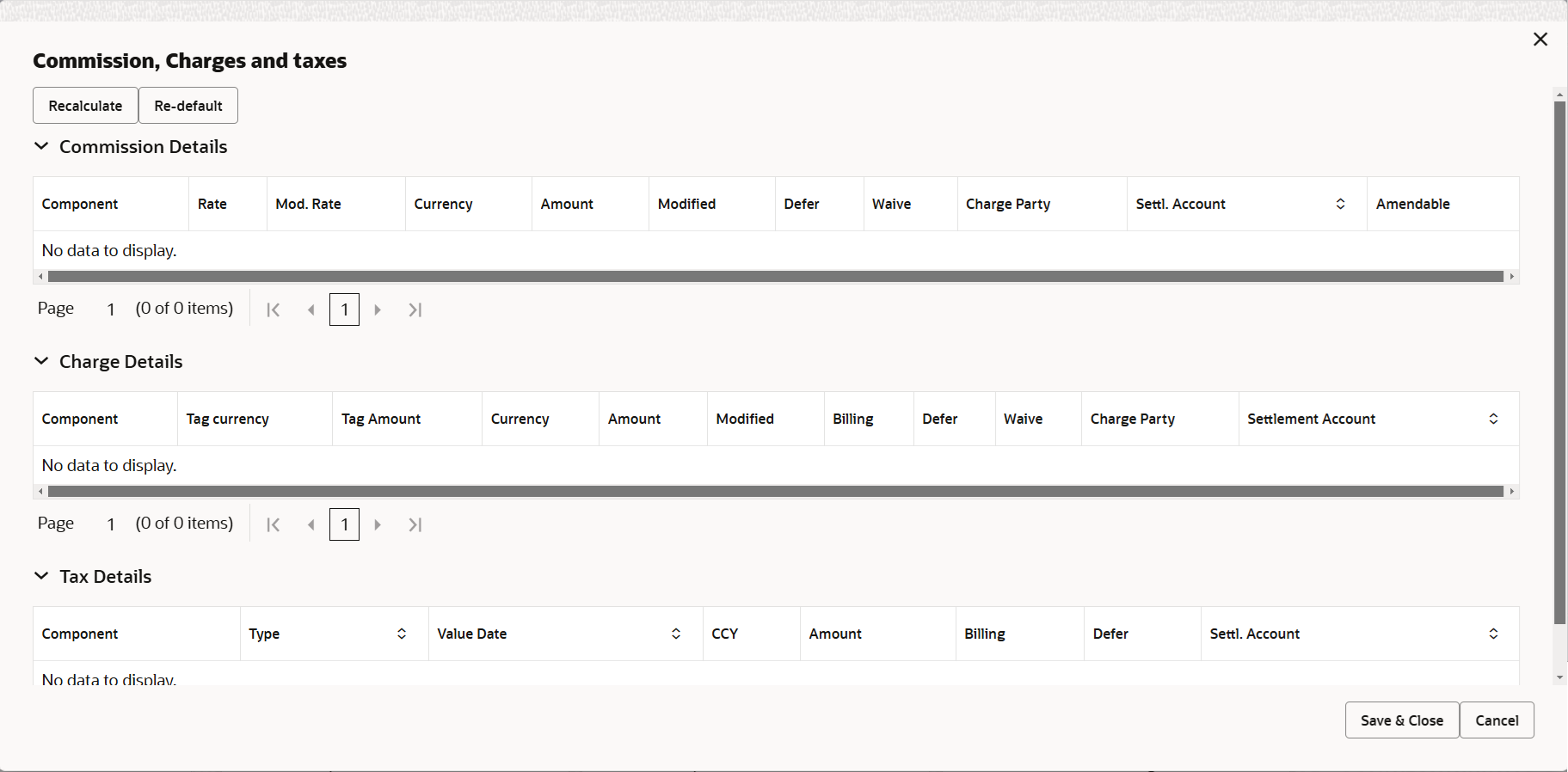 Charge Party Charge party is applicant by default. User can change the value to beneficiary. Settlement Account Select the settlement account. Tax Details This section displays the tax details. The tax component is calculated based on the commission and defaults if maintained at product level. User cannot update tax details and any change in tax amount on account of modification of charges/ commission will be available on click of Re-Calculate button or on hand off to back-end system.