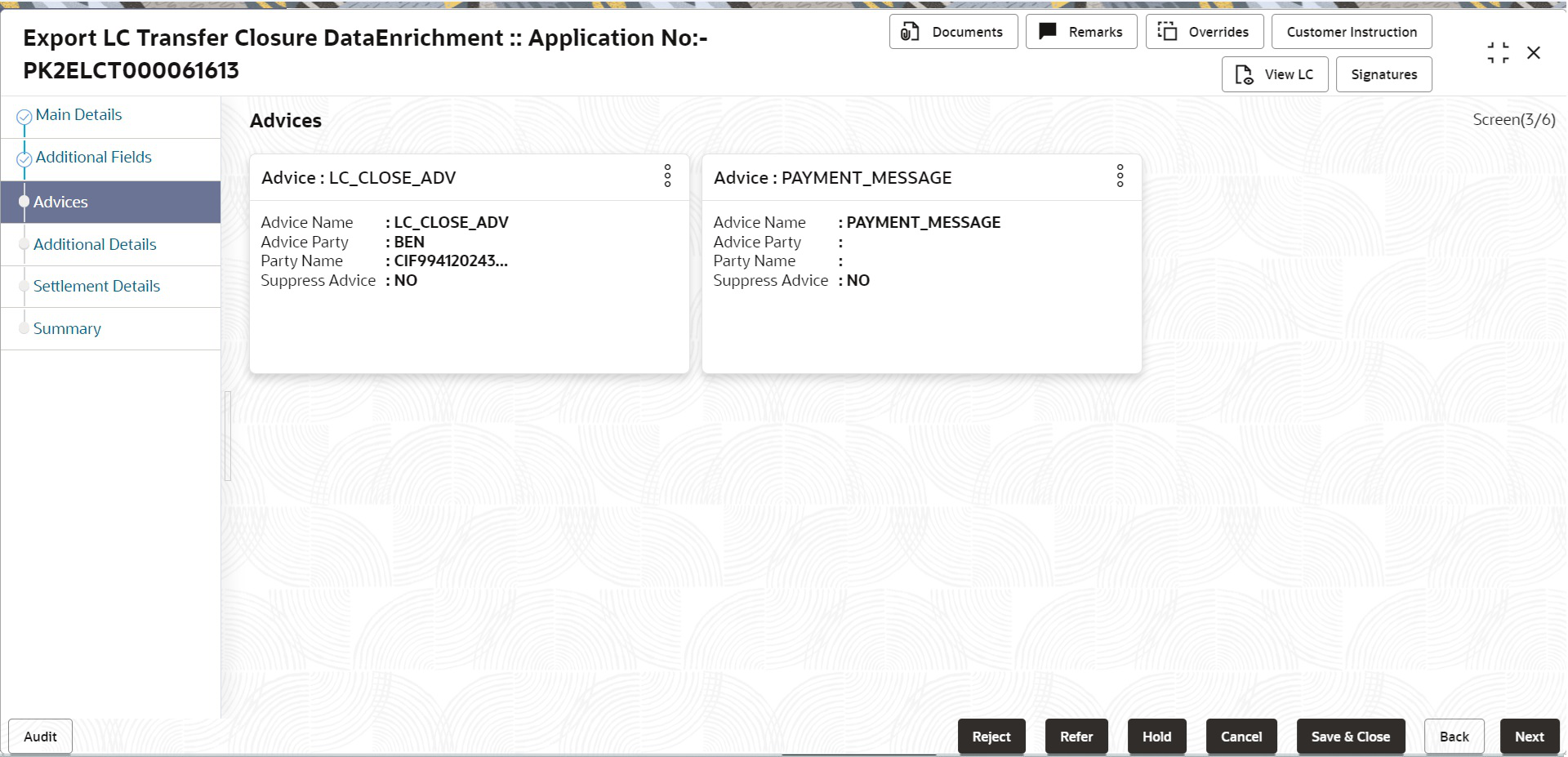 This topic provides the systematic instructions to capture the advices details of Export LC Transfer Closure process.
