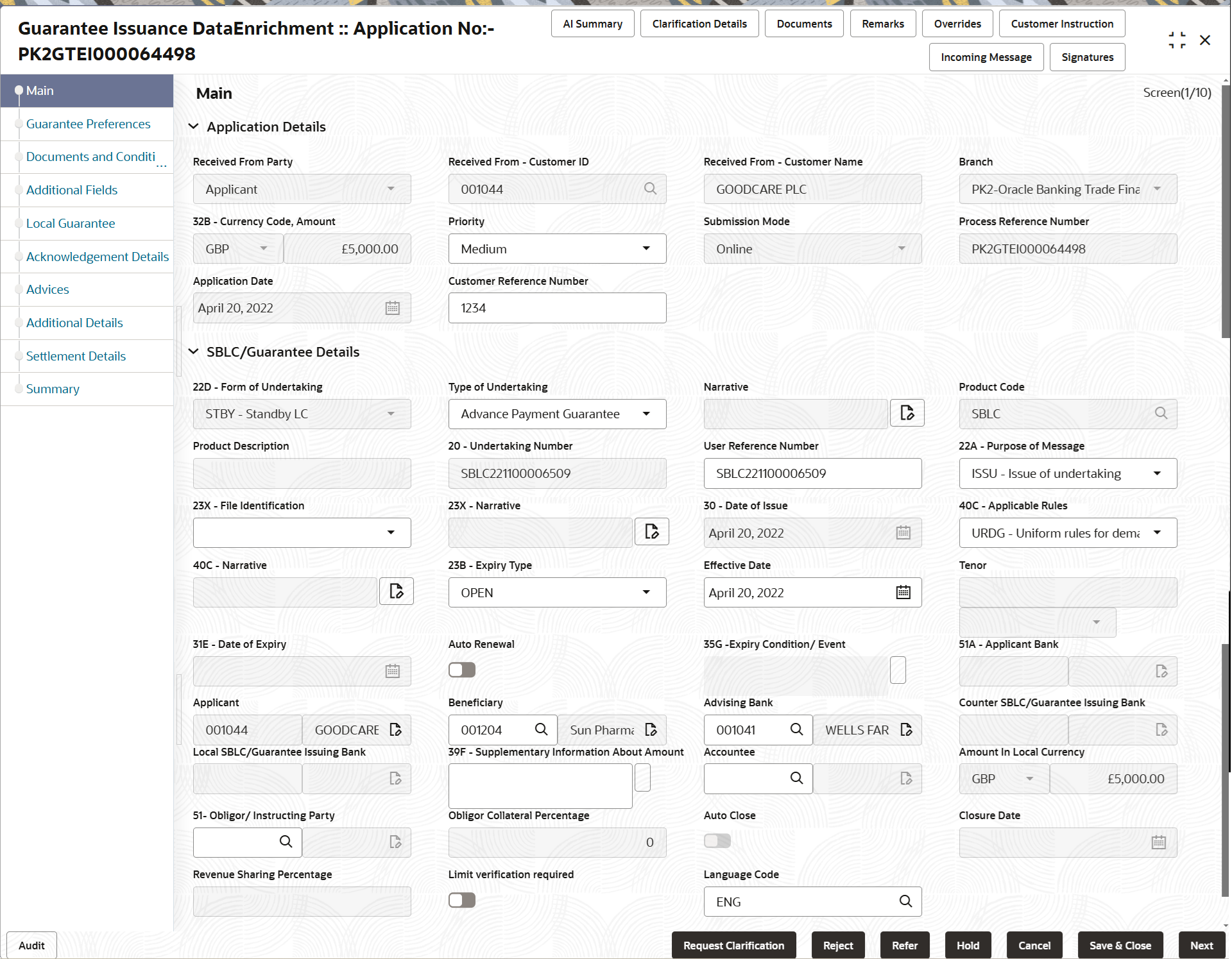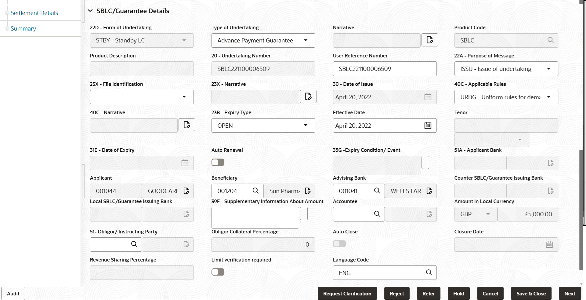 Figure 2-19 SBLC/Guarantee Details