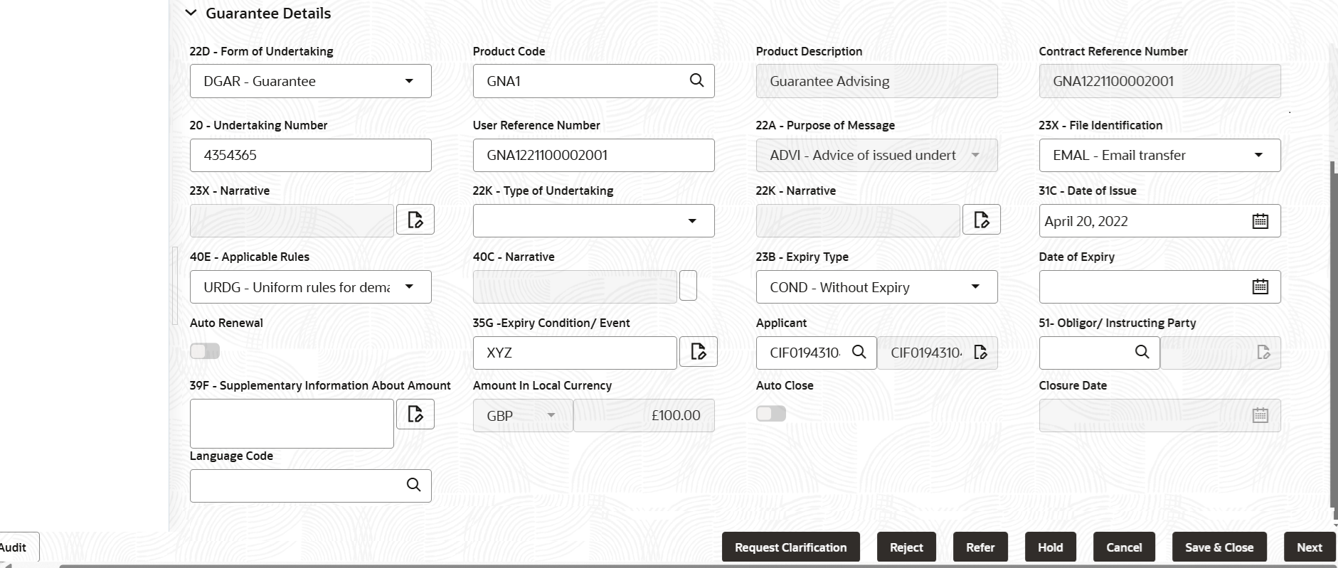Undertaking Number Specify the undertaking number available in the guarantee/SBLC. User Reference Number This field displays the user reference number, simulated from the back office. Number will be populated on the selection of Product Code.