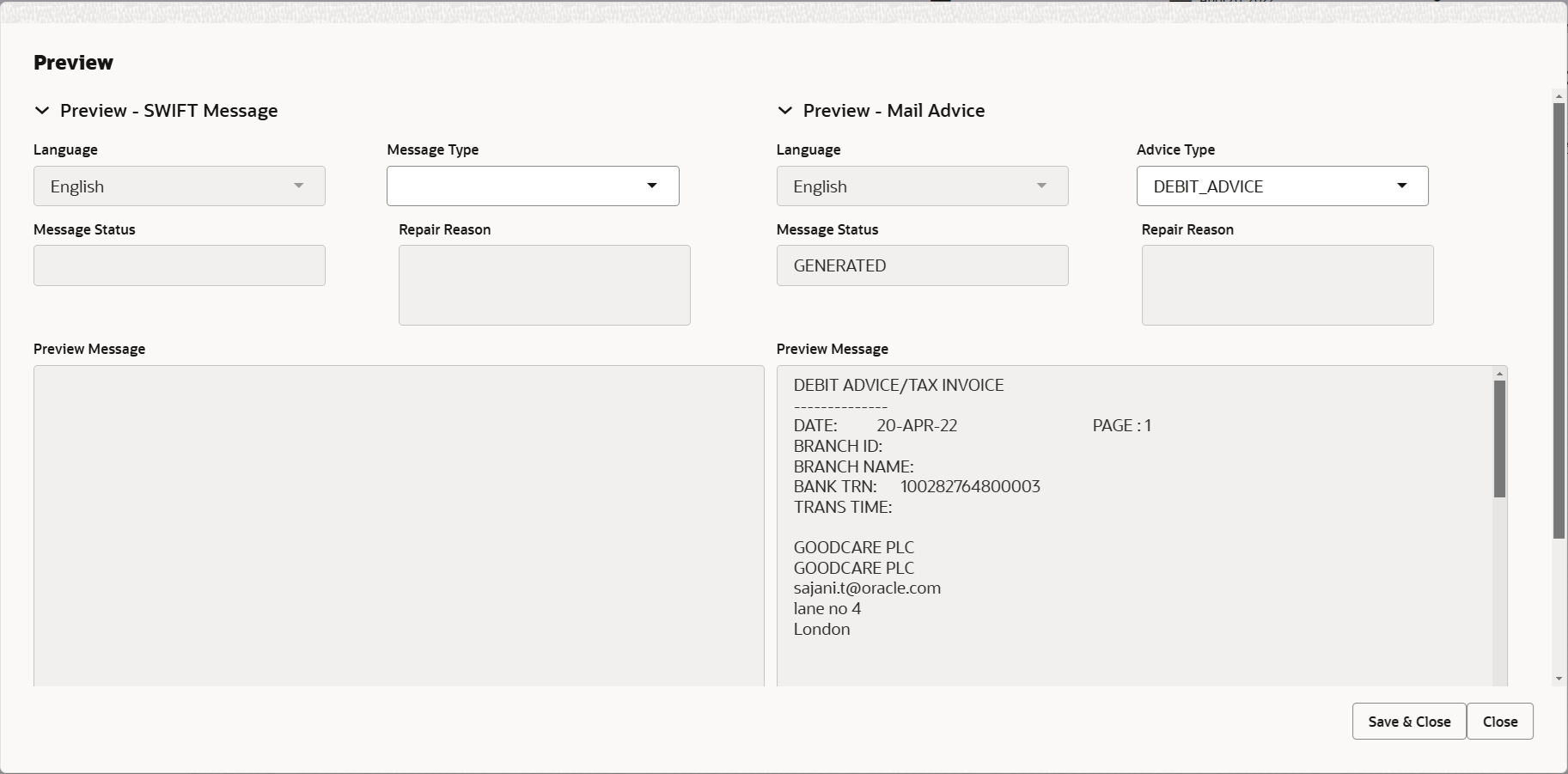 Field Description Preview SWIFT Message Language Read only field. The language to preview the draft guarantee details.