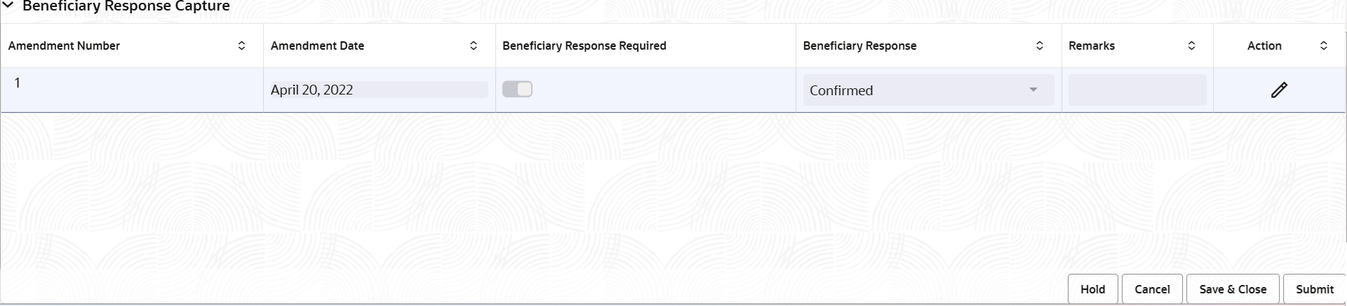 Beneficiary Response CaptureSystem will default the list of amendment issued with details of amendment date, Beneficiary consent Required status, Beneficiary Response and Remarks in this section.