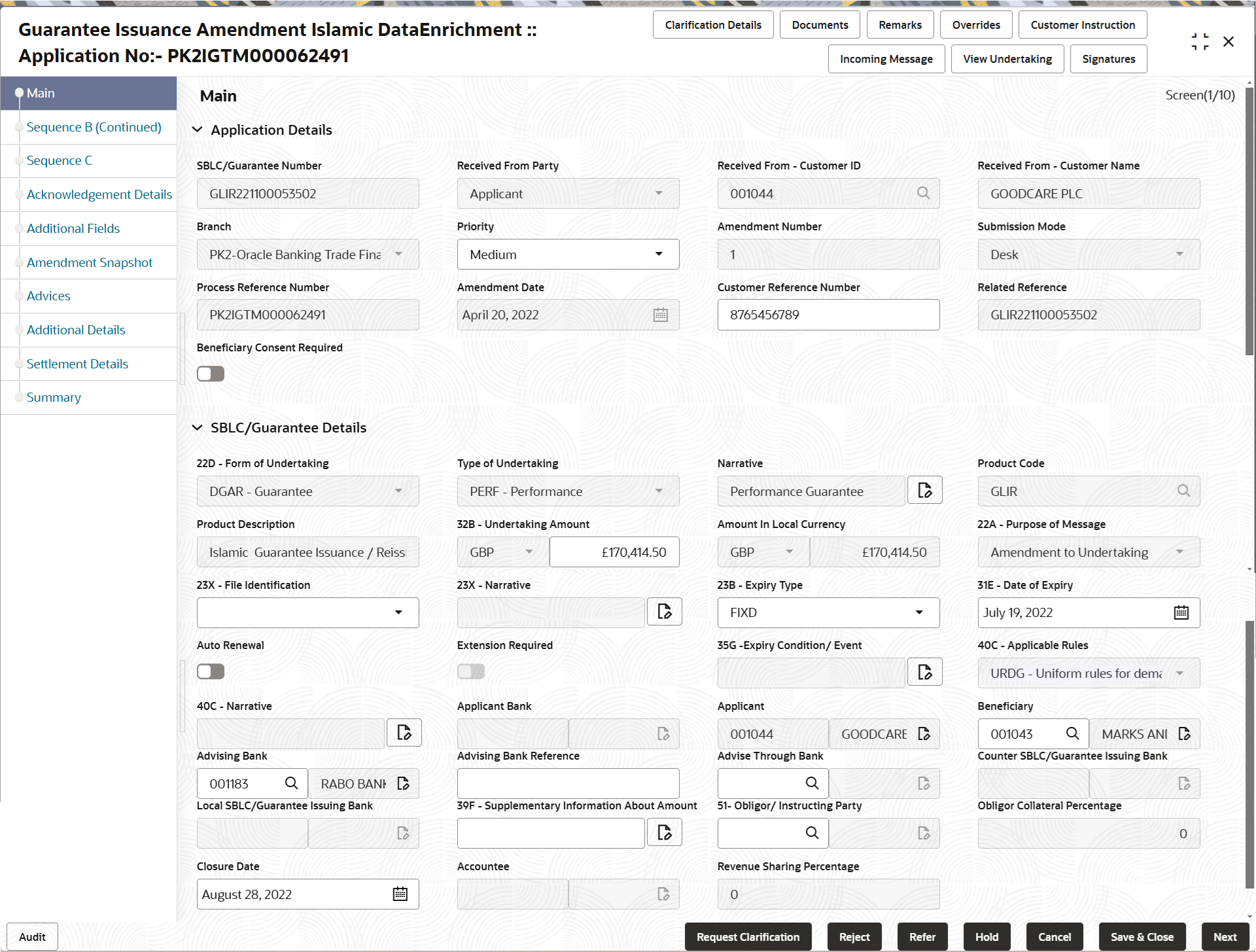 This topic provides the systematic instructions to initiate the main details of Data Enrichment stage of Guarantee Issuance Amendment - Islamic request.