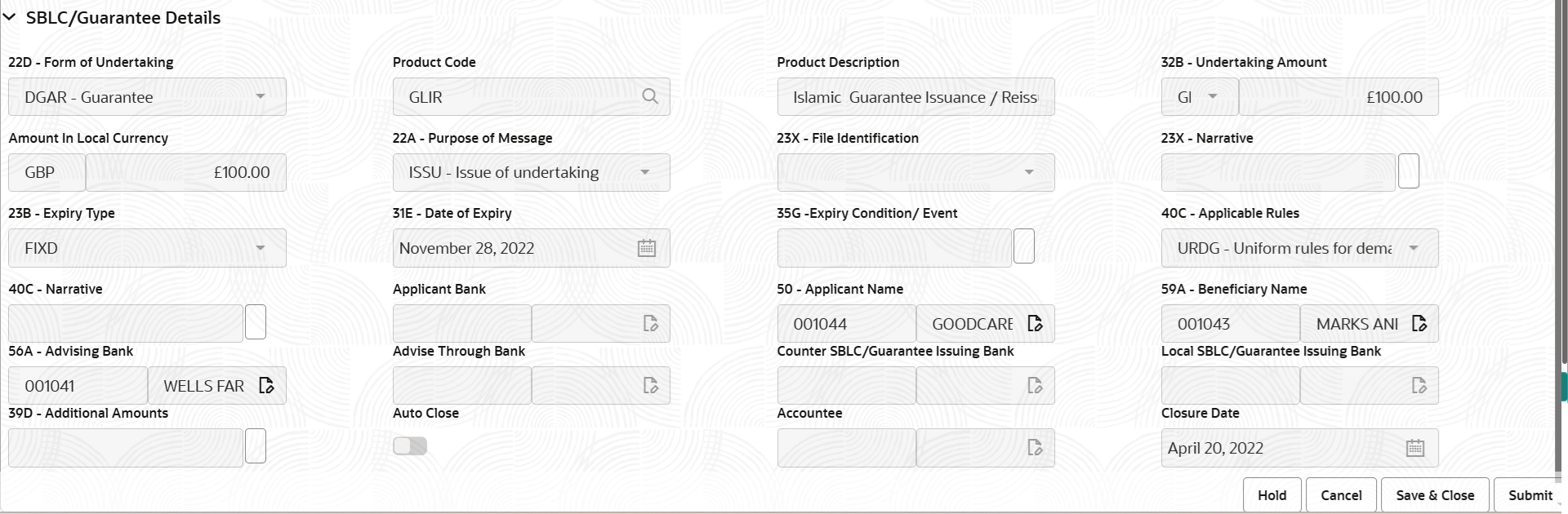 Product Code Read only field. Product code is auto-populated from guarantee /SBLC issuance.