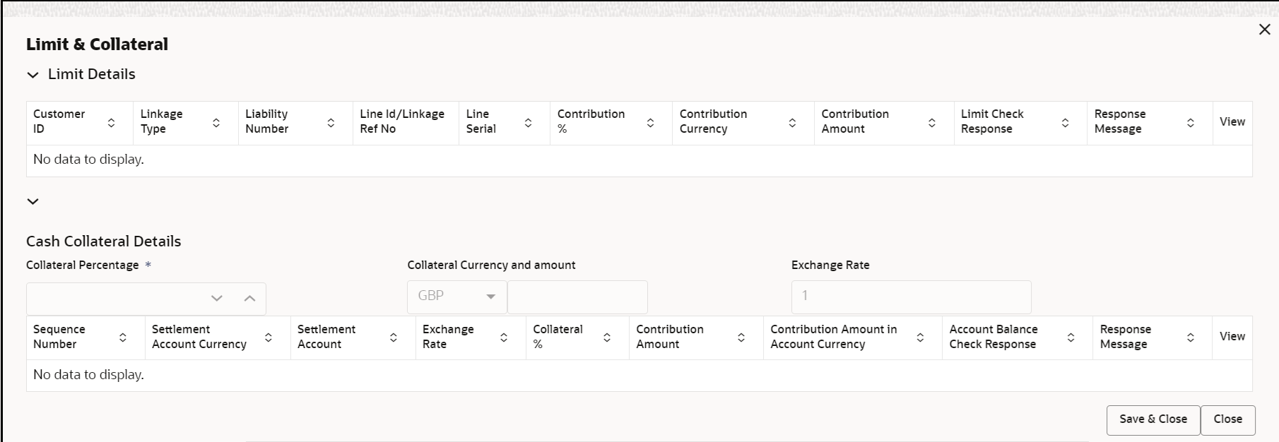 Edit Click edit link to edit the collateral details. Account Available Amount This field displays the account available amount which will be auto-populated based on the settlement account selection. - Click Save and Close to save the details and close the