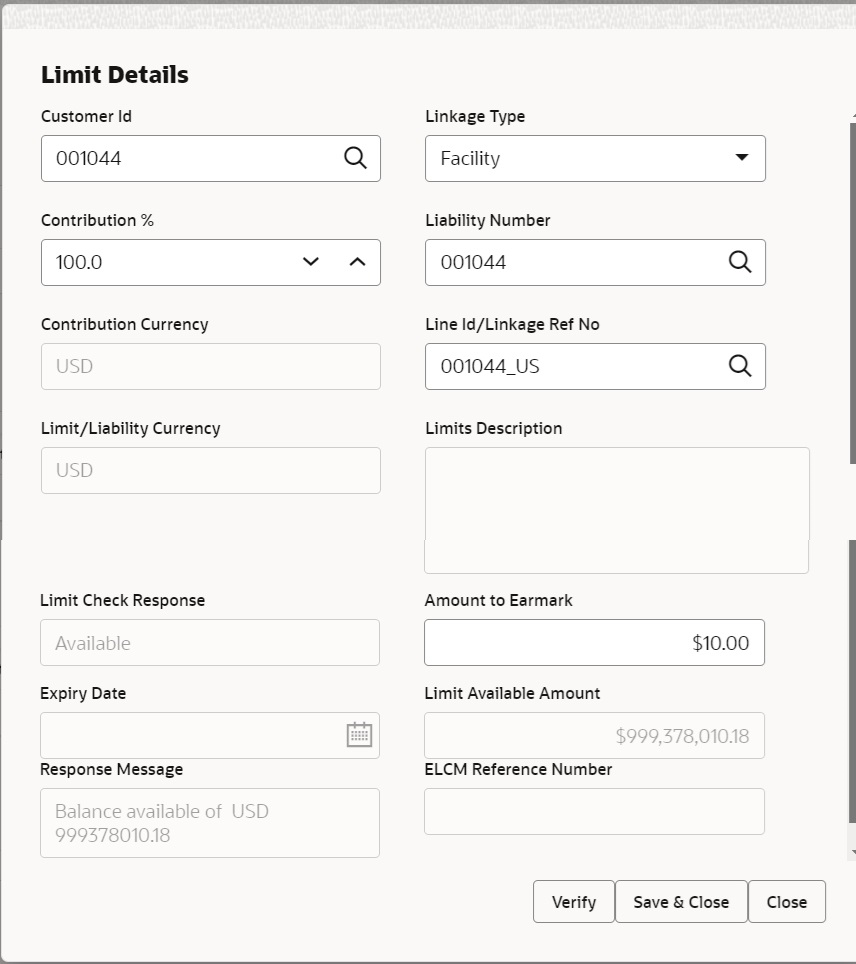 Expiry Date This field displays the date up to which the Line is valid. Limit Available Amount This field displays the value of available limit, i.e., limit available without any earmark. The Limit Available Amount must be greater than the Contribution Amount. The value in this field appears, if you click the Verify button.