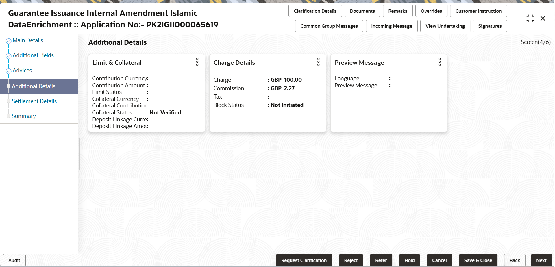Preview Message This field displays a preview of the draft message. Based on the guarantee text captured in the previous screen, guarantee draft is generated in the back office and is displayed in this screen.
