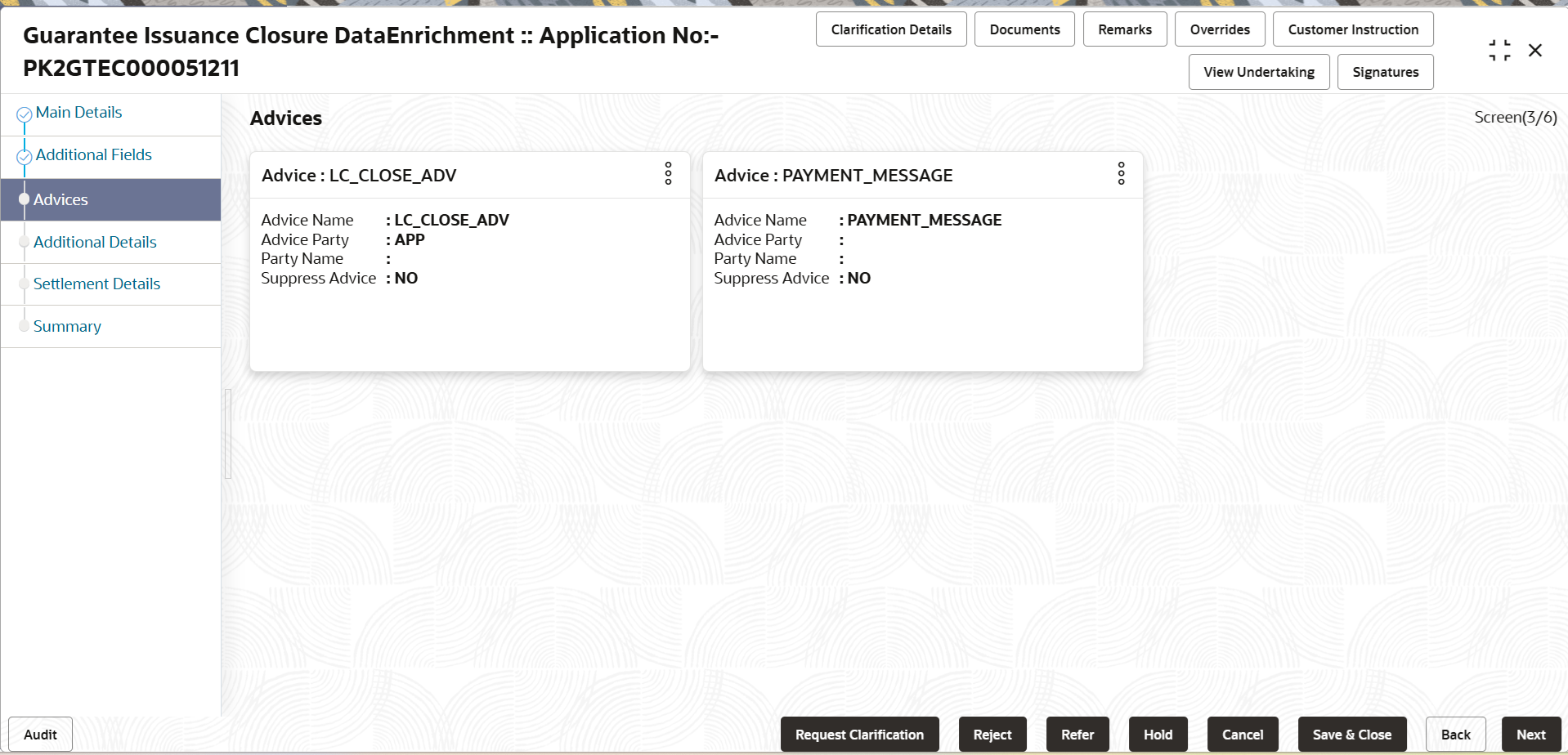 Data Enrichment user can view the advices generated for Closure of Guarantee/SBLC Issued request. Some of the possible advices are Closure of Guarantee/SBLC Issued and Payment Message.