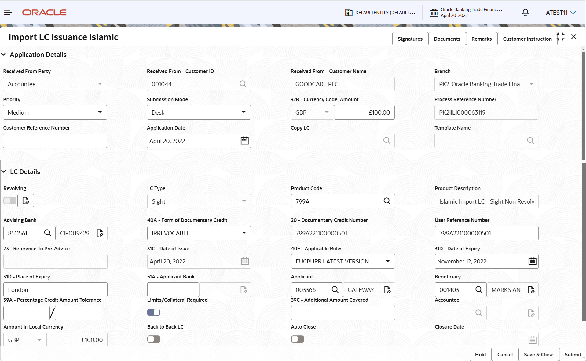- Under Import - Documentary Credit, click Import LC Issuance Islamic.The Import LC Issuance Islamic screen is displayed.