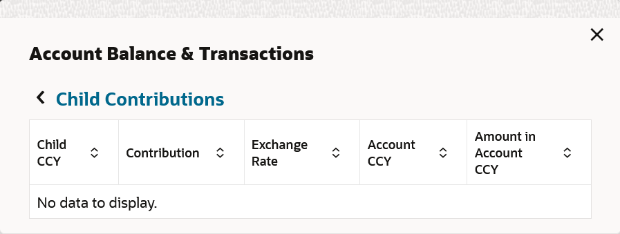 Field Description Child CCY Displays the blocked child contribution currency. Contribution Displays the blocked child contribution amount for a specific currency. Exchange Rate Displays the exchange rate applied to derive the equivalent amount in parent account currency. Account CCY Displays the parent account currency. Amount in Account CCY Displays the blocked child contribution equivalent amount in parent account currency. - Click Close icon to close and navigate back to the selected screen.