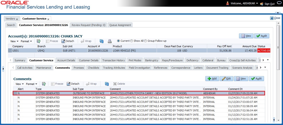 An outbound comment is posted on the corresponding account in Customer Service > Comments