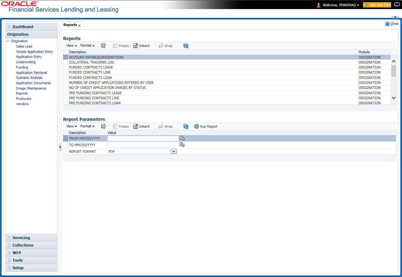 On the Oracle Financial Services Lending and Leasing home page, click Origination > Origination > Reports.
