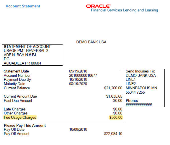 The Statements tab in Customer Service > Account Details tab displays the Fee Usage Charge(+) that is posted to lease usage account. On generating a report of lease account, the Fee Usage Charges are indicated as separate line item.