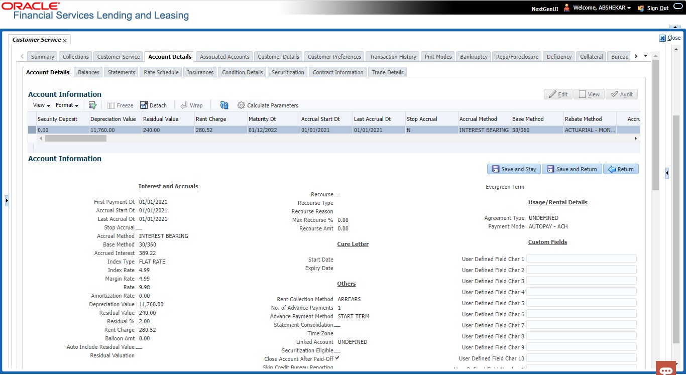 Oracle Financial Services Lending and Leasing enables you to view account details using Account Details sub tab. In addition, you can use this screen to derive various account level business specific calculations and populate the computed values into the custom user defined fields.