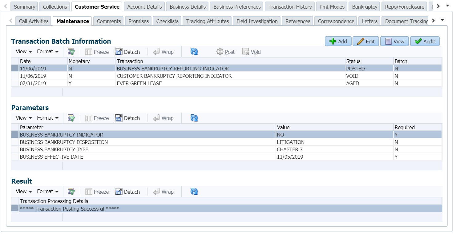 Before posting the transaction, system validates if the existing customer’s/business bankruptcy indicator is set as Y. If yes, an error is displayed and transaction is not allow to post.
