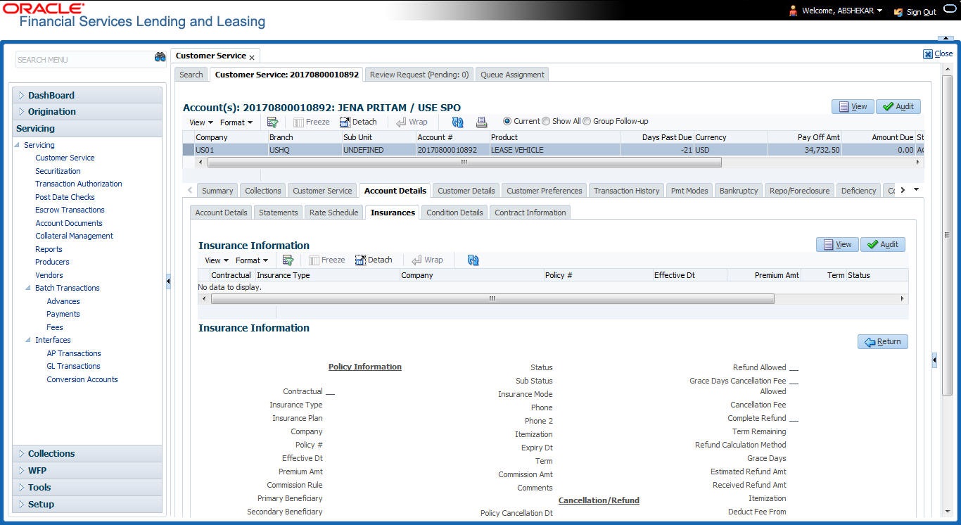 If insurance information was entered on Funding screen during Lease origination, you can view financed insurance information on the Customer Service screen’s Insurances screen. The Insurances screen displays the details of all financed insurances, including cancellation and refund information whenever applicable. It also displays the insurances that were financed after funding of Lease using the Customer Service screen’s Maintenance screen.
