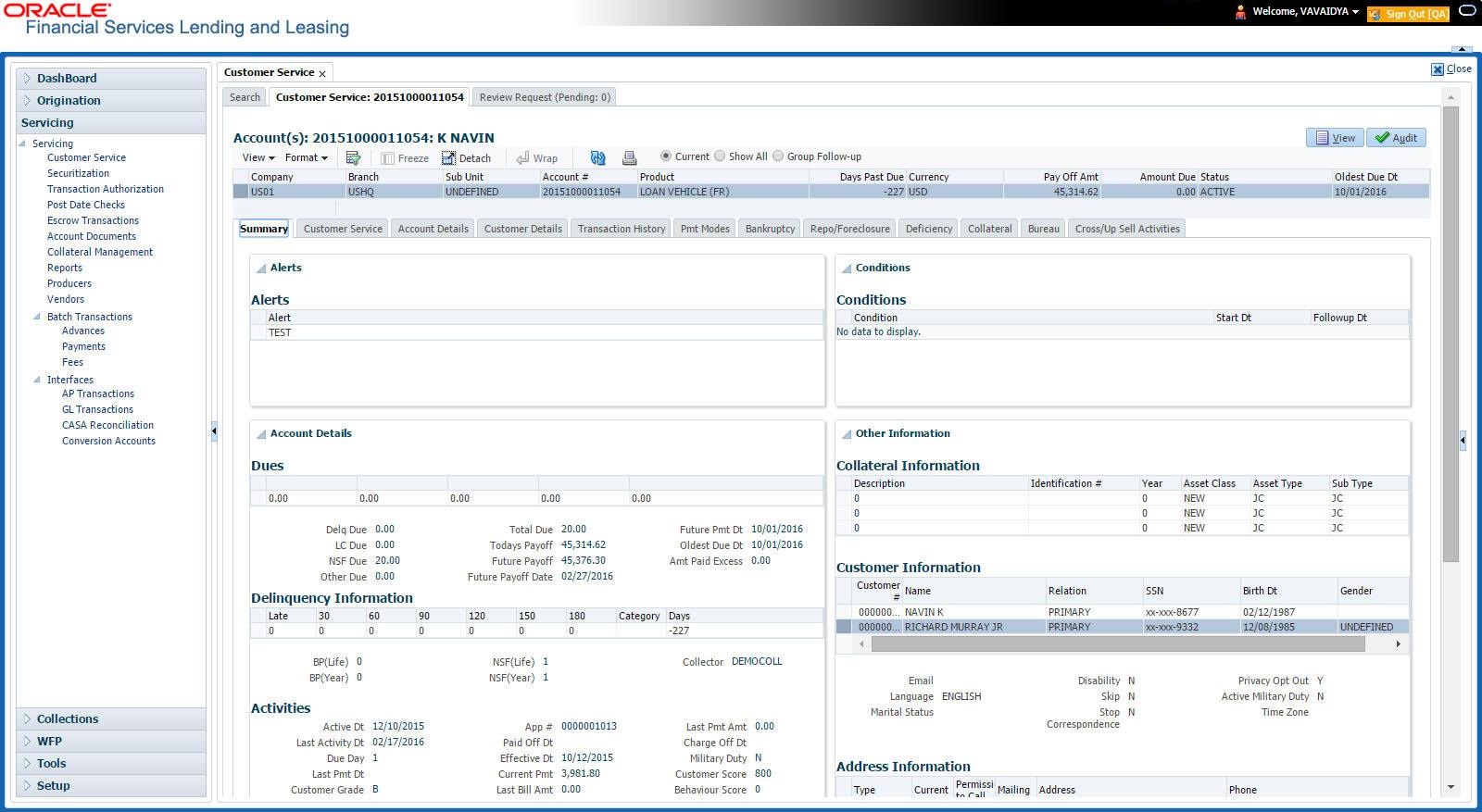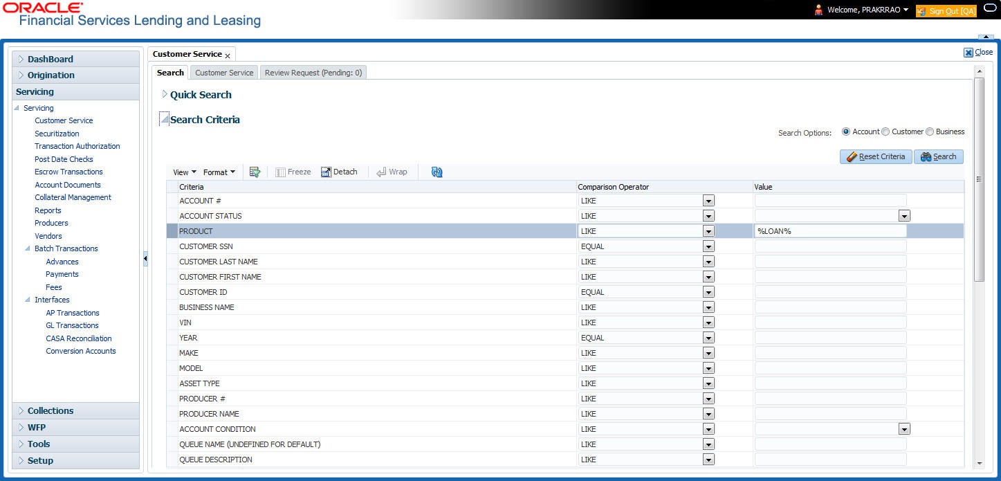 On the Oracle Financial Services Lending and Leasing home screen, click Servicing > Servicing > Customer Service > Search Criteria.