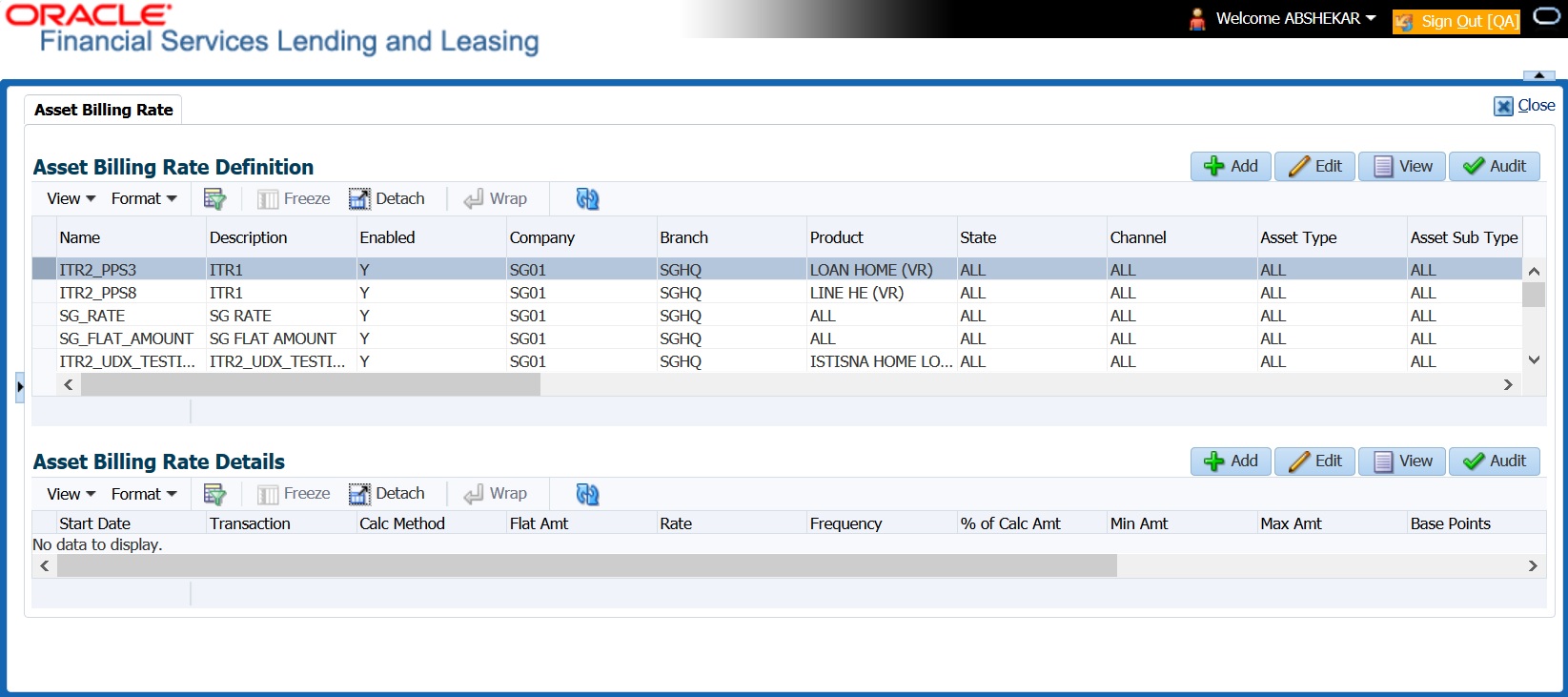 - On the Oracle Financial Services Lending and Leasing home screen, click Setup > Setup > Administration > User > Products > Asset Billing Rate.