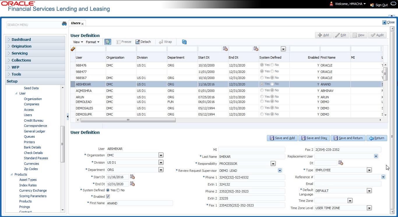 Organization Select the organization to which the user belongs, from the dropdown list. Division Select the division to which the user belongs, from the drop-down list. Department Select the department to which the user belongs, from the dropdown list. Start Dt Specify the start date for the user. You can also select from the adjoining calender icon. End Dt Specify the end date for the user. You can also select from the adjoining calender icon. System Defined Select Yes, if the entry is system defined. System defined entries cannot be modified.