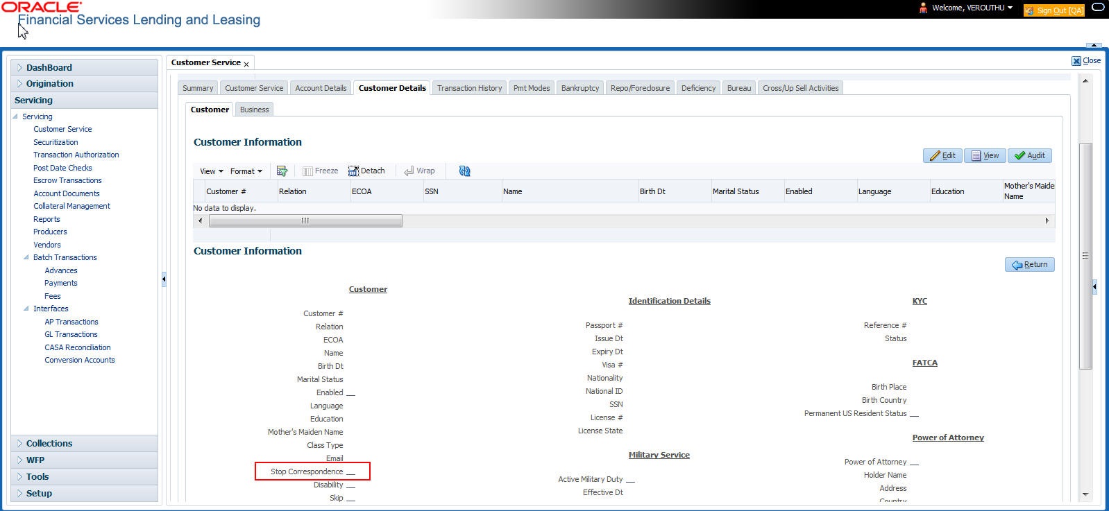 To remove the Stop Correspondence indicator, follow the above procedure and update the CUSTOMER/BUSINESS STOP CORR INDICATOR as NO.