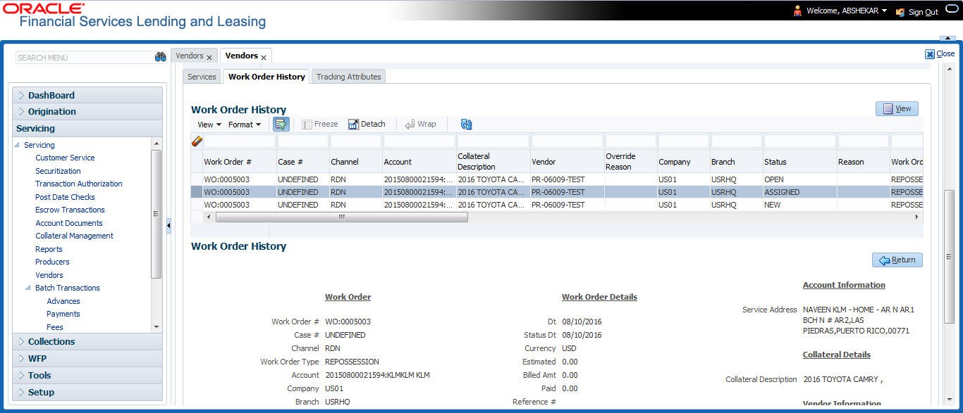 The Work Order History sub tab displays the details of the selected work orders in the sequence of the changes done i.e. last change details appear as the first record.