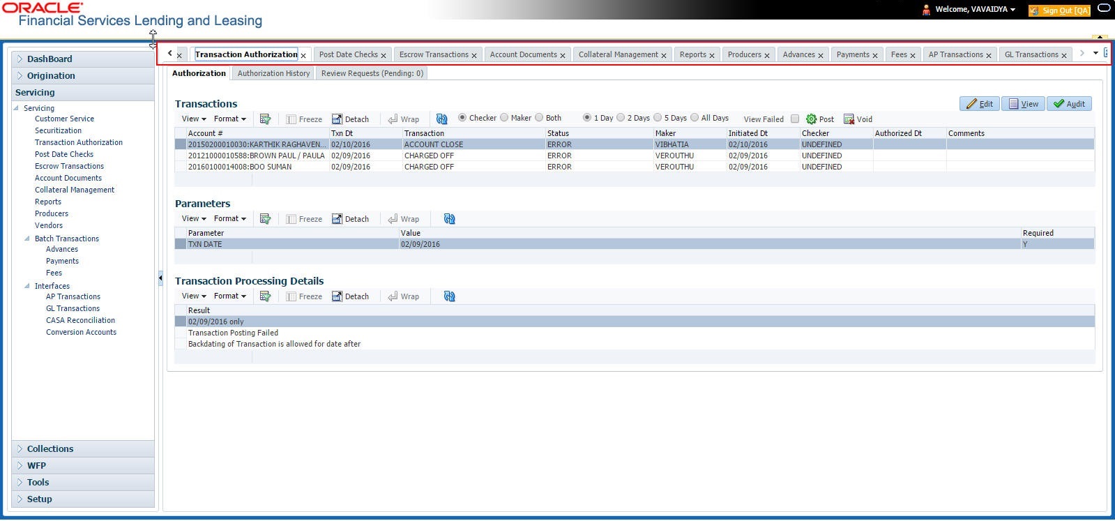Having this option enabled you can view and update a maximum of 15 Accounts in parallel tabs and Oracle Financial Services Lending and Leasing renders dynamic data across all the opened tabs.