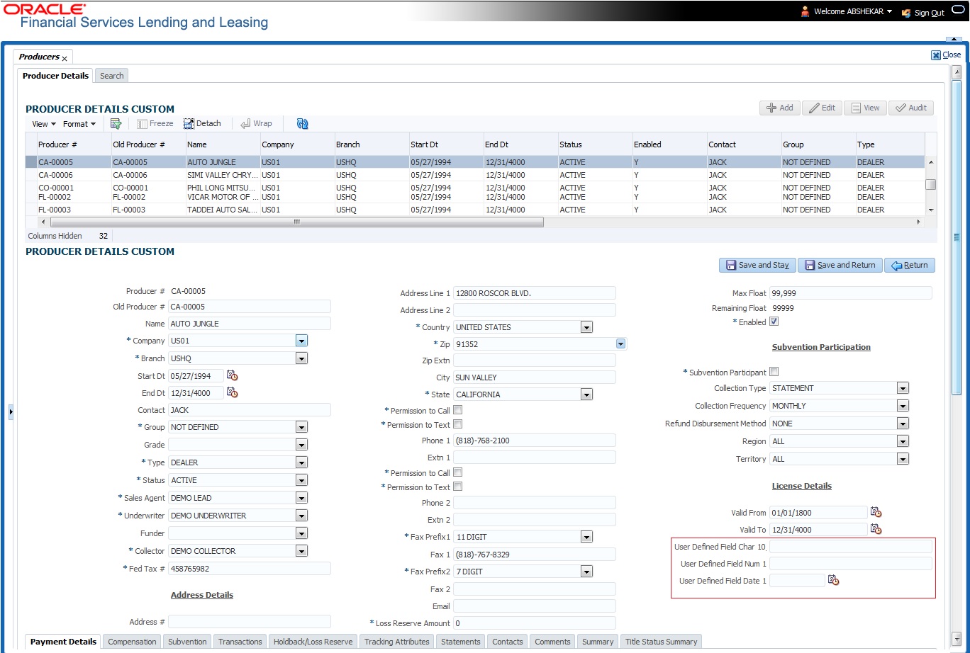 The Producer Details tab is a customizable tab in OFSLL in which you can enable new user defined fields (UDFs), disable /rename existing fields, allow or restrict access to UDFs, nonmandatory fields and also set the field as mandatory/non-mandatory for user input.