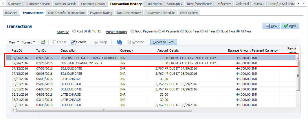 When a posted Due Date Change Override transaction contains error or non desired results, you can reverse the same in Customer Service > Transaction History > Transactions screen.