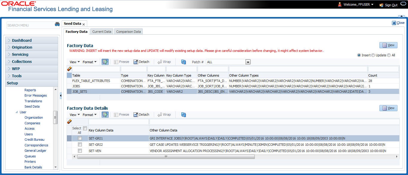 The Factory Data tab displays the list of both existing and updated seed data which are provided though release/patch installation. In the Factory Data tab you can select and update only the required seed data changes into the respective seed data tables. During update, you can also skip the seed data changes for later updates (if required).