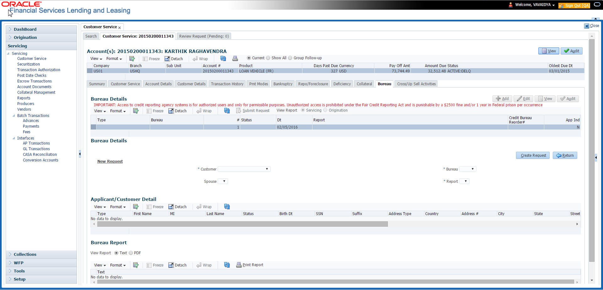 The Customer Service screen Bureau screen enables you to view credit bureau reports associated with the account that were pulled during servicing for account. You can also use the Bureau screen to create and pull additional credit bureau reports and view the results as a text only file.
