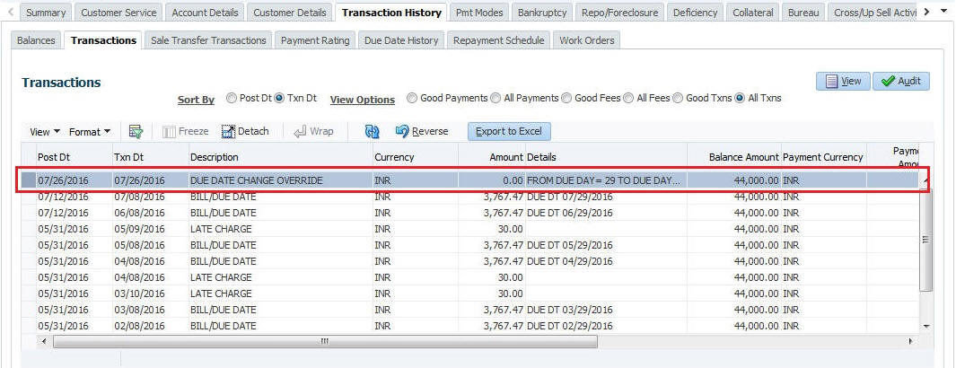 On successful posting of the transaction, system automatically increases the number on counters (i.e. number of times due date change permitted) for Max Due Day Change/Yr and Max Due Day Change/Life. The transaction is displayed in Customer Service > Transaction History > Transactions screen.