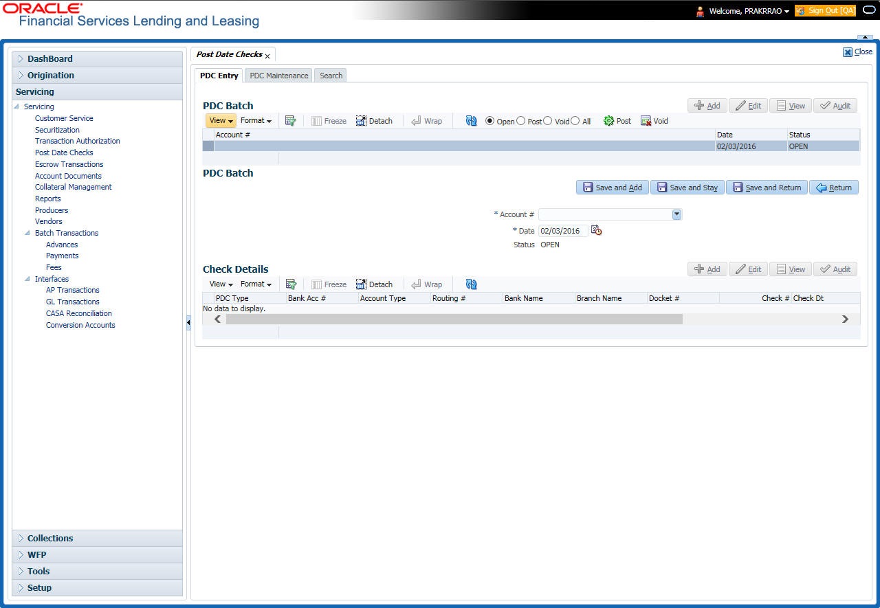 The View Options section enables you to view PDC batches by status (Open, Post, Void, and All). You can choose whether the PDCs from the customer are for a single Loan account or for multiple Loan accounts in the same bank. Once you enter the Loan account number of the customer in the PDC Batch section, The system displays all Loan accounts pertaining to the customer.
