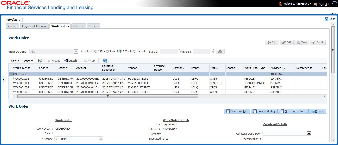 - In the Servicing > Servicing > Vendors > Work Order > Work Order, sort the list of work orders based on status using the View Options drop- down list. You can further sort the list of work orders based on elapsed days by selecting the View Last option as 1 Day / 1 Week / 1 Month / By Date. When By Date is selected you can specify a date range (within 3 months) in Start Dt and End Dt fields using the adjoining calendar and clicking Search.
