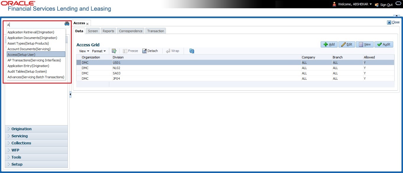 The Search box in the LHS facilitates for an intuitive search of required screens in Oracle Financial Services Lending and Leasing. For example, on typing the first letter of the screen, the search box displays a list of all available screens starting with the letter entered in alphabetical order. You can click on the required screen and press Enter. The screen is displayed in the main window/work area.