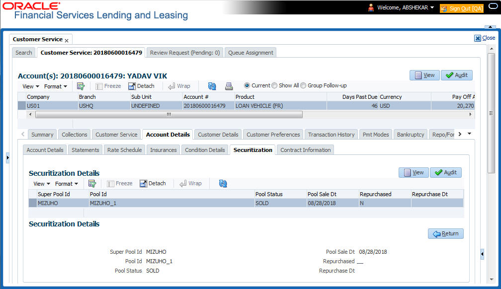 Securitization Details Super Pool Id View the Super Pool Id (Sold Securitization Pool). The same is displayed as Undefined if Super Pool Id is not configured for the pool. Pool Id The pool ID. Pool Status The pool status. Pool Sale Dt Pool Sale date. Repurchased If selected, indicates that it has been repurchased. Repurchase Dt The repurchase date.
