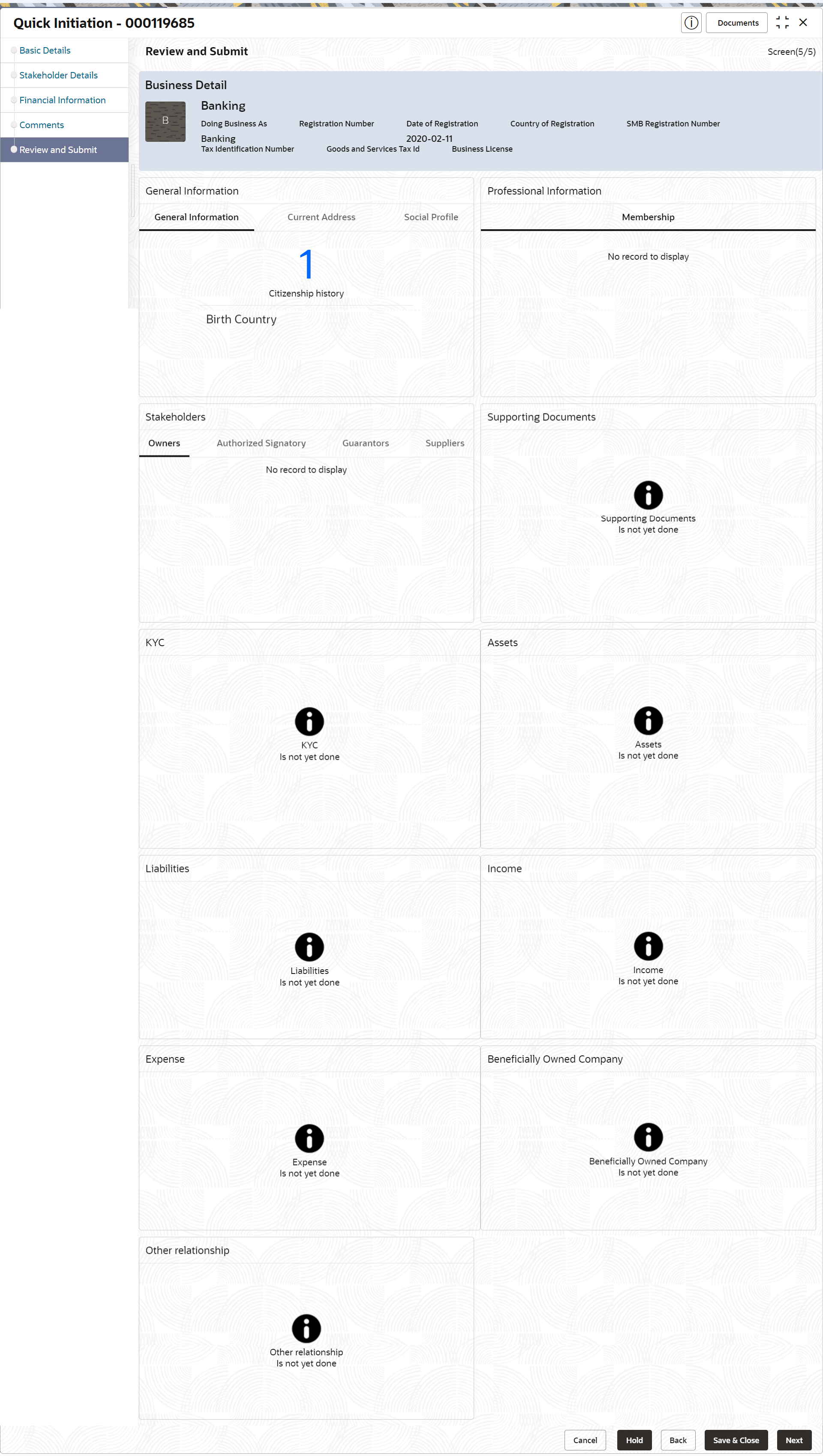 The Review and Submit screen provides a consolidated view of the information captured in all the sections.